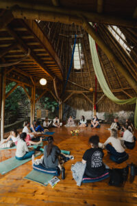 With the three double bamboo beams running across the roof, there is space for eight aerial yoga hammocks for classes, retreats or yoga teacher trainings.